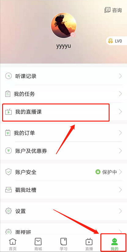 3、點(diǎn)擊“我的”,進(jìn)入“我的個(gè)人中心”點(diǎn)擊“我的直播課”進(jìn)入直播課頁(yè)面