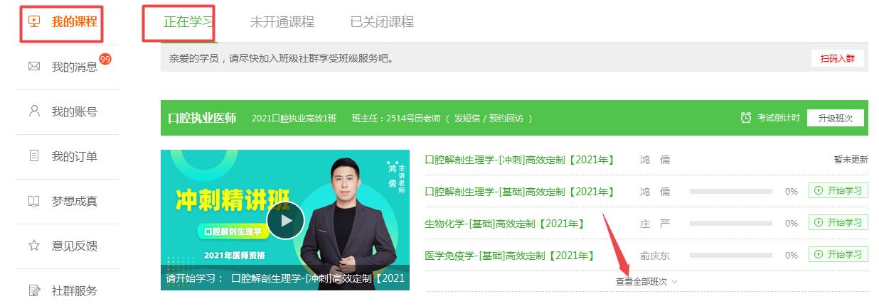 (一)電腦端:從醫(yī)學教育網(wǎng)首頁進入“我的網(wǎng)校我的家”-“我的課程”-“查看更多班次”