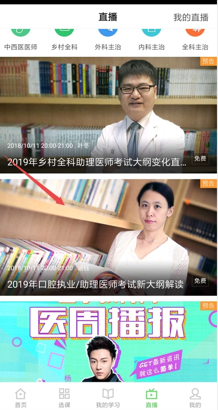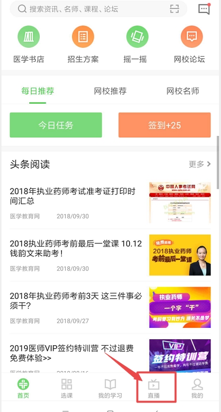 1.打開醫(yī)學(xué)教育網(wǎng)APP,底部菜單欄選擇“直播”: