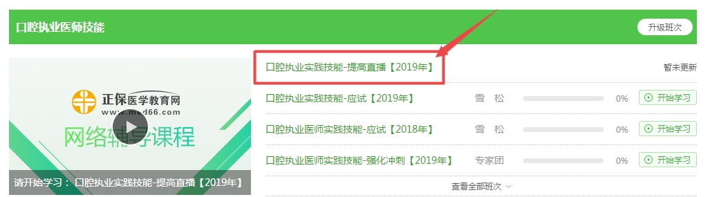 電腦端看課:從醫(yī)學(xué)教育網(wǎng)首頁進(jìn)入“我的網(wǎng)校我的家”-“我的課程”-“口腔執(zhí)業(yè)醫(yī)師實(shí)踐技能”-“提高直播【2019年】”(示例如下)