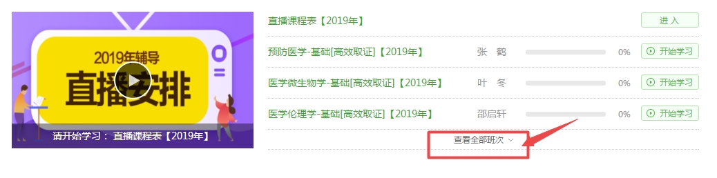 電腦端看課:從醫(yī)學(xué)教育網(wǎng)首頁(yè)進(jìn)入“我的網(wǎng)校我的家”-“我的課程”-“查看班次”-“教輔領(lǐng)讀”(示例如下)