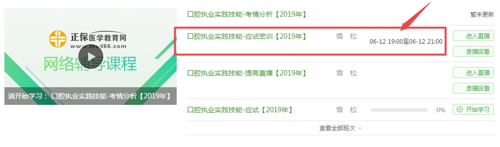電腦端看課:從醫(yī)學(xué)教育網(wǎng)首頁進(jìn)入“我的網(wǎng)校我的家”-“我的課程”-“口腔執(zhí)業(yè)醫(yī)師實踐技能”-“應(yīng)試密訓(xùn)”(示例如下)