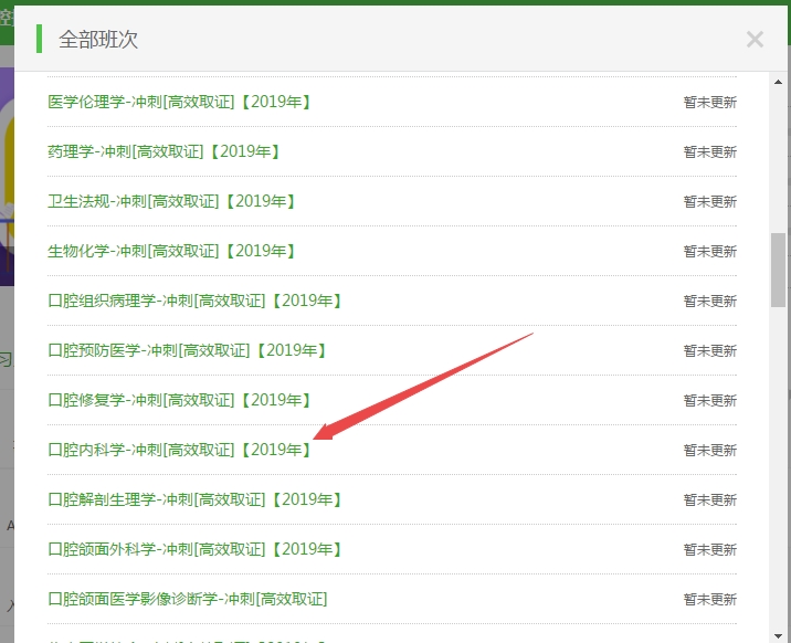 電腦端看課:從醫(yī)學(xué)教育網(wǎng)首頁進(jìn)入“我的網(wǎng)校我的家”-“我的課程”-“查看全部班次”-“口腔內(nèi)科-沖刺”(示例如下)