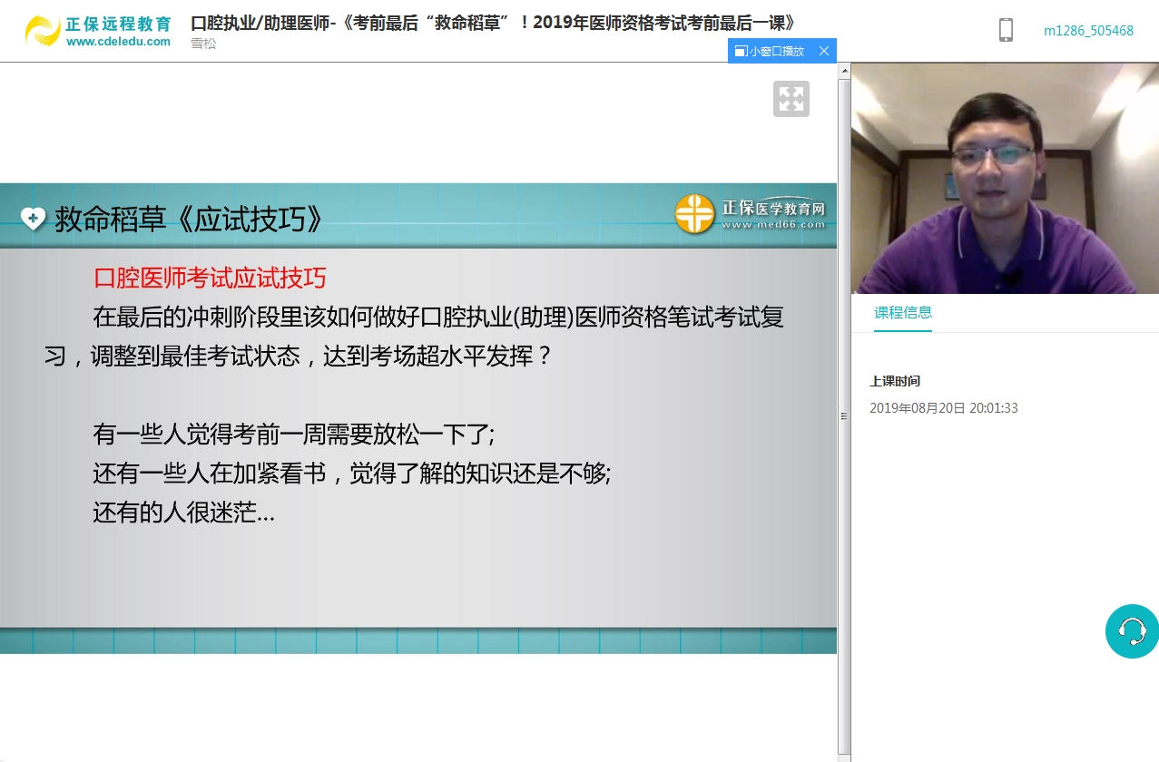 2019年口腔執(zhí)業(yè)/助理醫(yī)師綜合筆試考試即將到來,各位考友準(zhǔn)備好了嗎?是不是在迷??记斑€應(yīng)該做些什么?還在疑問最后幾天還能如何升華一下自己的考試技巧?那就鎖定8月20日晚20:00-21:00雪松老師免費直播——《考前最后“救命稻草”!2019年口腔醫(yī)師考前最后一課》,你想要的這里都有,敬請準(zhǔn)時觀看!