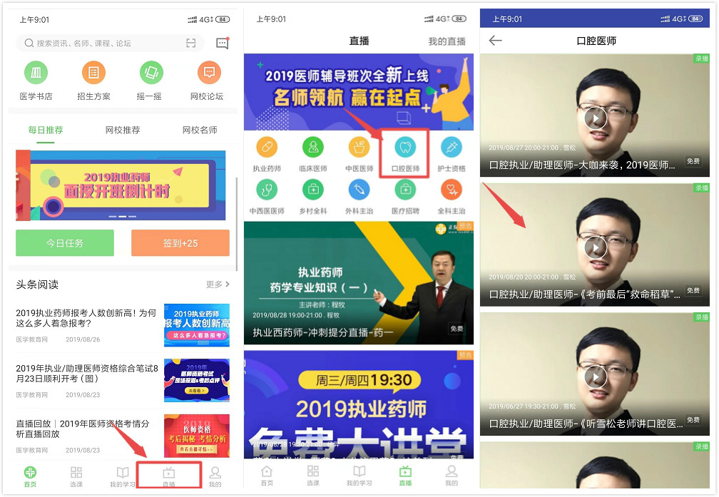 3、點擊下方“直播”-->進(jìn)入列表頁,找到口腔執(zhí)業(yè)/助理醫(yī)師老師直播課,點擊進(jìn)入后就可觀看課程。
