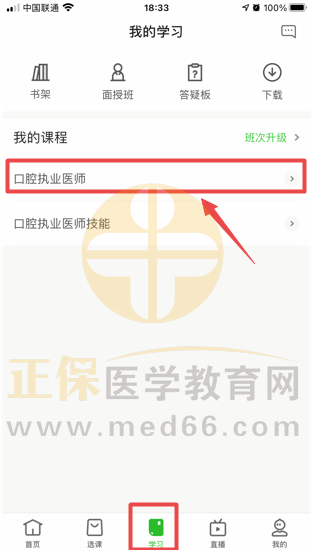 3、點擊底部菜單“學(xué)習(xí)”,進(jìn)入“我的課程”點擊“口腔執(zhí)業(yè)醫(yī)師”進(jìn)入聽課頁面:
