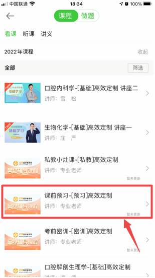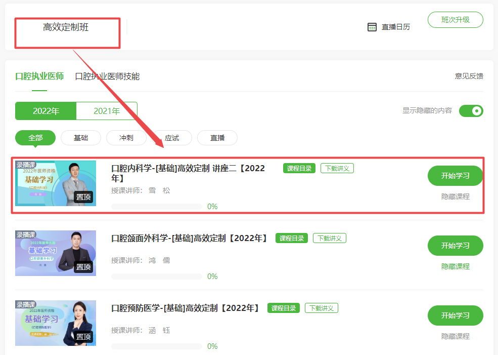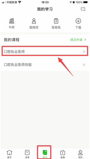 3、點擊底部菜單“學習”,進入“我的課程”點擊“口腔執(zhí)業(yè)/助理醫(yī)師”進入聽課頁面:
