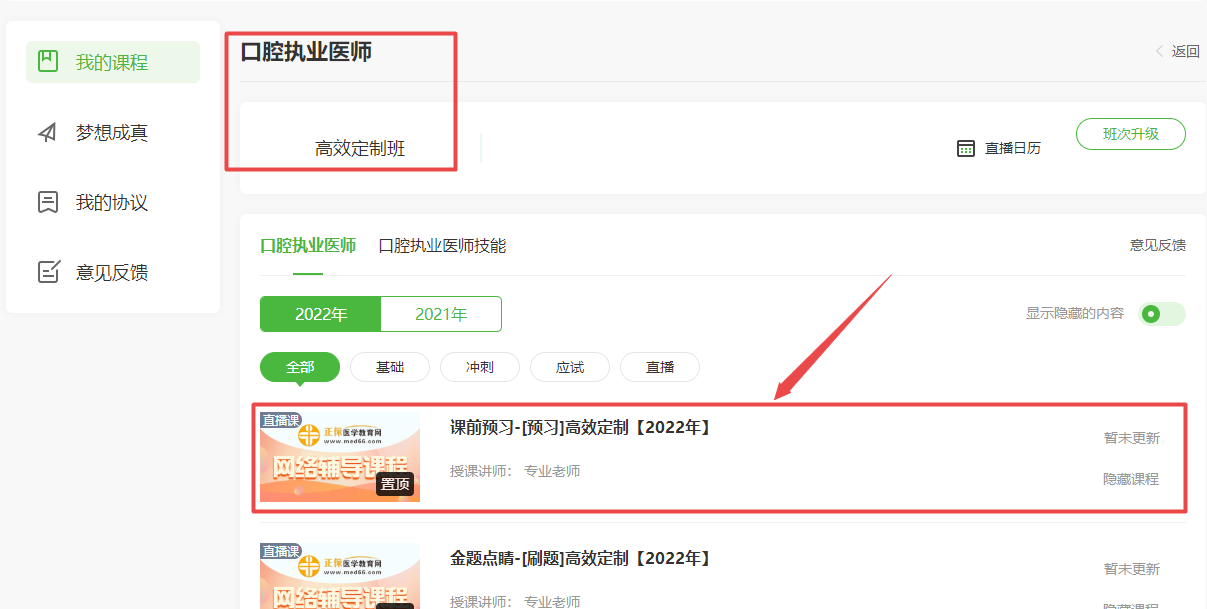 從醫(yī)學教育網(wǎng)首頁進入“我的網(wǎng)校我的家”-“我的課程”-“進入學習”-“直播”-私教小灶課,直播前開放直播入口;