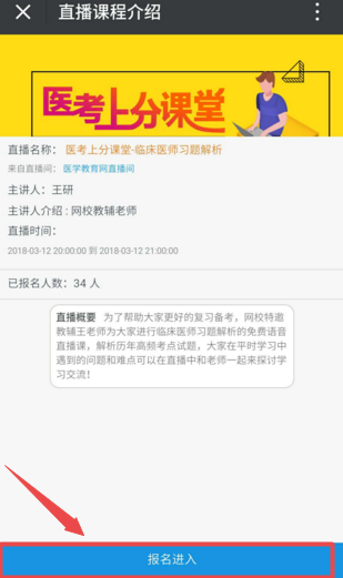 第三步、點(diǎn)擊底部“報(bào)名進(jìn)入”,直播開(kāi)始前會(huì)有微信消息通知: