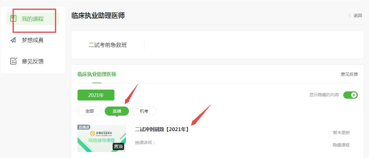 從醫(yī)學教育網(wǎng)首頁進入“我的網(wǎng)校我的家”-“我的課程”-“進入學習”-“直播”
