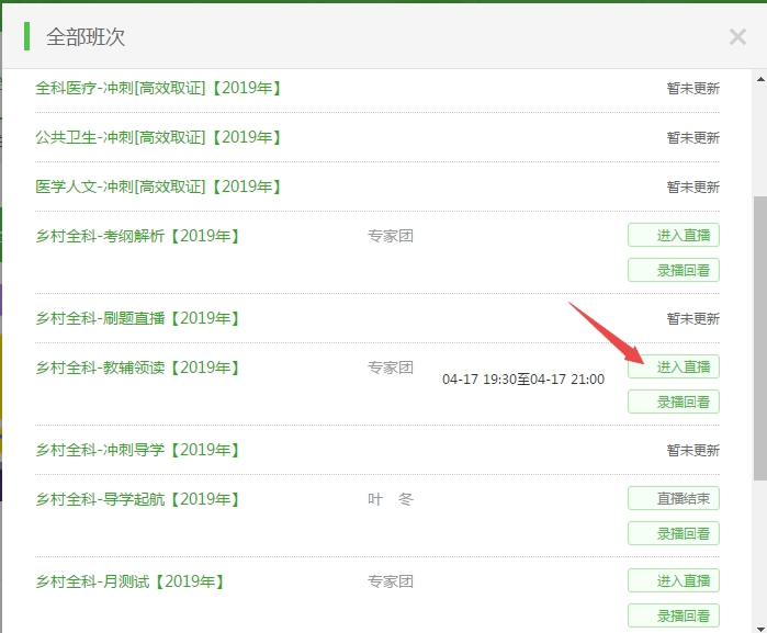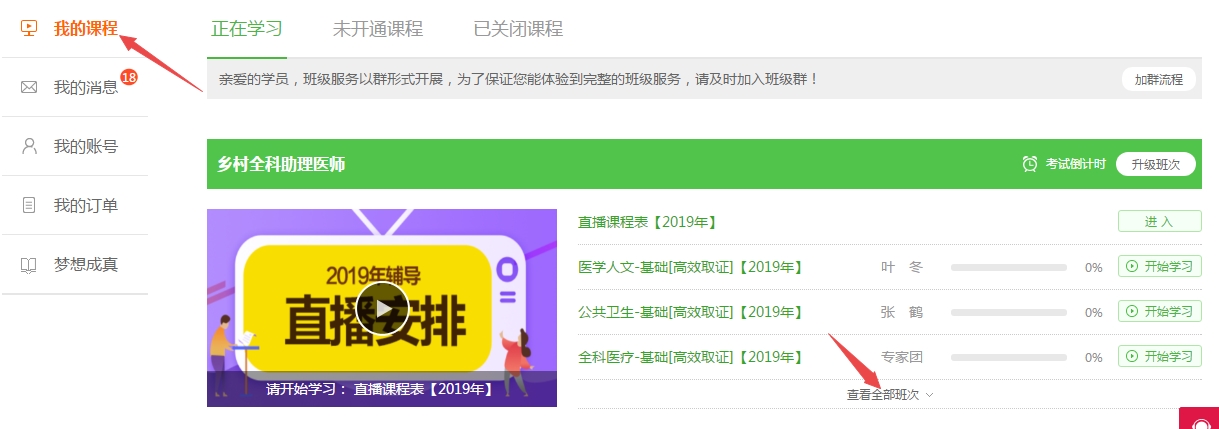 電腦端看課:從醫(yī)學(xué)教育網(wǎng)首頁(yè)進(jìn)入“我的網(wǎng)校我的家”-“我的課程”-“查看全部班次”-“教輔領(lǐng)讀進(jìn)入直播”(示例如下)