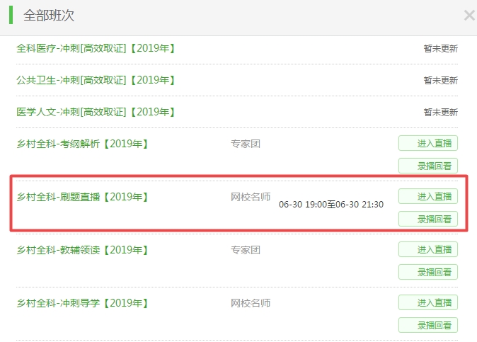 電腦端看課:從醫(yī)學(xué)教育網(wǎng)首頁(yè)進(jìn)入“我的網(wǎng)校我的家”-“我的課程”-“查看全部班次”-“刷題直播”(示例如下)