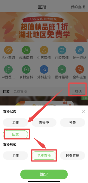 3、登錄成功后,點擊下方“直播”按鈕-->點擊“篩選”-->選擇要觀看免費直播回放視頻。