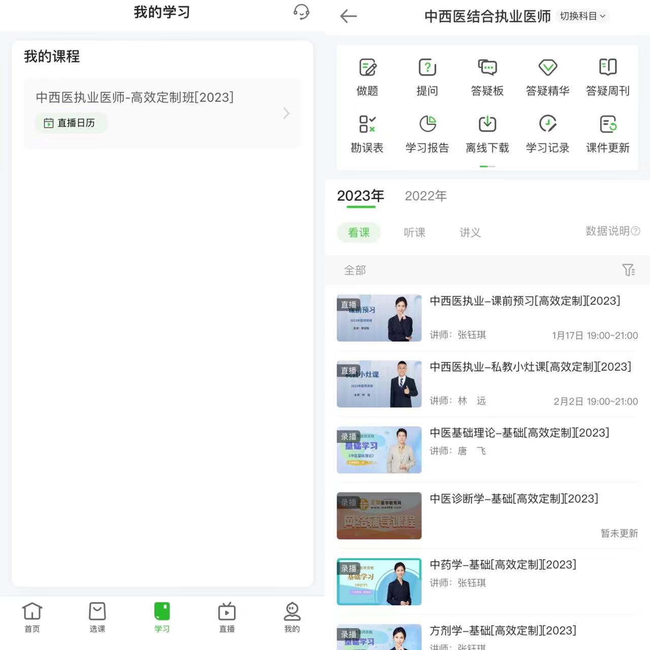 3、點(diǎn)擊底部菜單“學(xué)習(xí)”,進(jìn)入“我的課程”點(diǎn)擊“中西醫(yī)執(zhí)業(yè)”進(jìn)入聽課頁面: