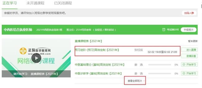電腦端直播看課:從醫(yī)學(xué)教育網(wǎng)首頁(yè)進(jìn)入“我的網(wǎng)校我的家”-“我的課程”-“查看更多班次”