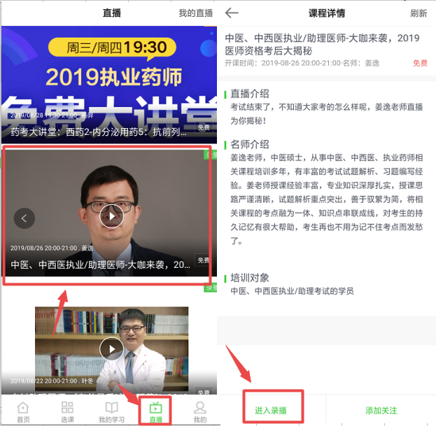 3、點(diǎn)擊下方“直播”-->進(jìn)入列表頁,找到中醫(yī)、中西醫(yī)執(zhí)業(yè)/助理醫(yī)師老師直播課,點(diǎn)擊進(jìn)入后就可觀看課程。