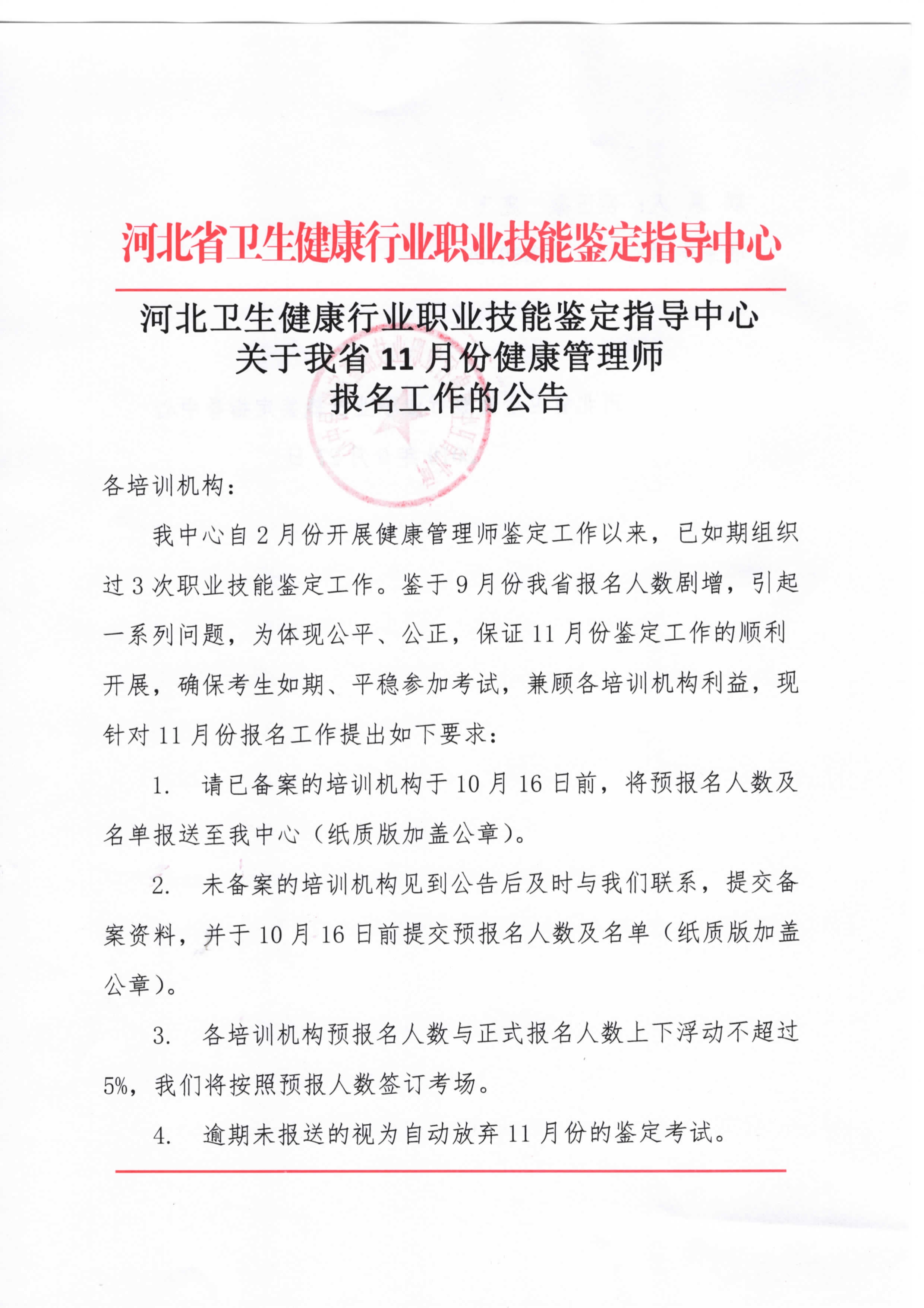 河北省11月份健康管理師報名工作安排與通知!為了幫助大家了解,醫(yī)學教育網為大家搜集整理如下: