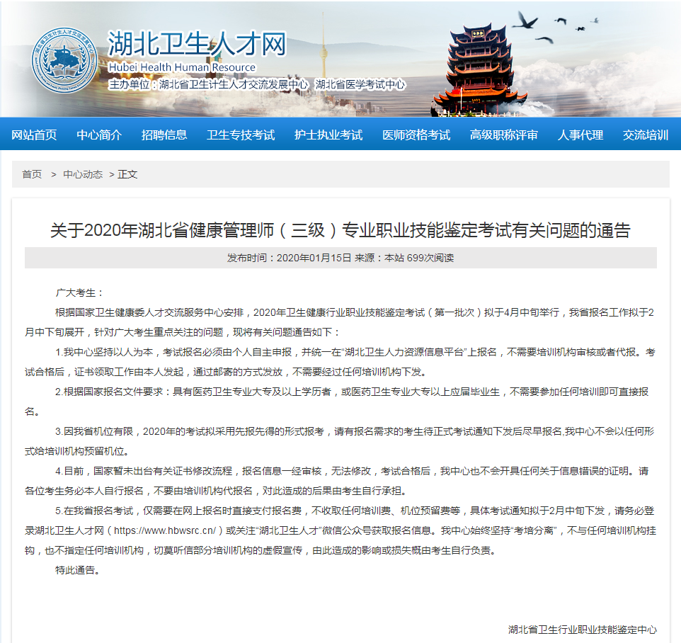5.在我省報(bào)名考試,僅需要在網(wǎng)上報(bào)名時(shí)直接支付報(bào)名費(fèi),不收取任何培訓(xùn)費(fèi)、機(jī)位預(yù)留費(fèi)等,具體考試通知擬于2月中旬下發(fā),請(qǐng)務(wù)必登錄湖北衛(wèi)生人才網(wǎng)(https://www.hbwsrc.cn/)或關(guān)注“湖北衛(wèi)生人才”微信公眾號(hào)獲取報(bào)名信息。我中心始終堅(jiān)持“考培分離”,不與任何培訓(xùn)機(jī)構(gòu)掛鉤,也不指定任何培訓(xùn)機(jī)構(gòu),切莫聽(tīng)信部分培訓(xùn)機(jī)構(gòu)的虛假宣傳,由此造成的影響或損失概由考生自行負(fù)責(zé)。