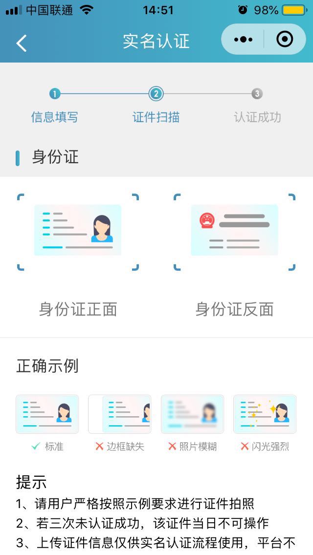 第三步:拍攝清晰的本人身份證正、反面照片并上傳;