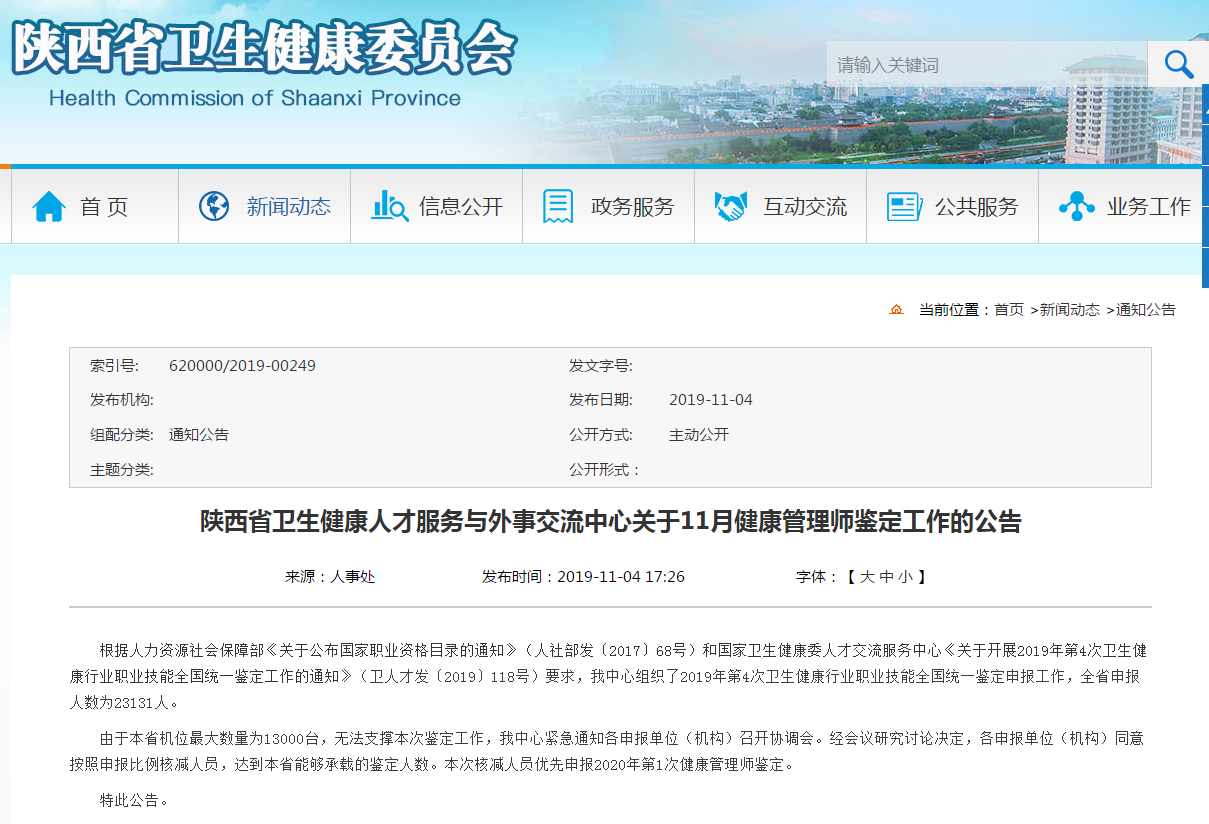 陜西省衛(wèi)生健康人才服務(wù)與外事交流中心關(guān)于11月健康管理師鑒定工作的公告發(fā)布啦!很多朋友對此非常關(guān)注,醫(yī)學(xué)教育網(wǎng)小編特意為大家收集整理了如下內(nèi)容,希望能夠幫到大家!