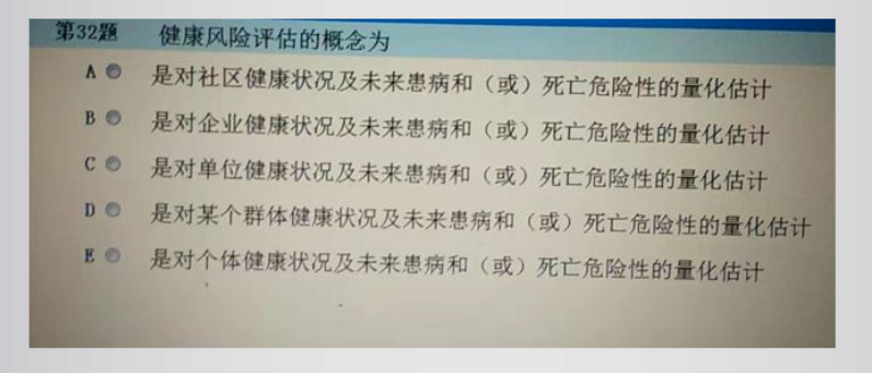 考試形式如下圖示意,這道選擇題“健康風(fēng)險評估的概念”為單選,當(dāng)確認好答案后選擇前面的按鈕即可,選擇后點擊下一步視為本道題答題結(jié)束,不可返回修改。