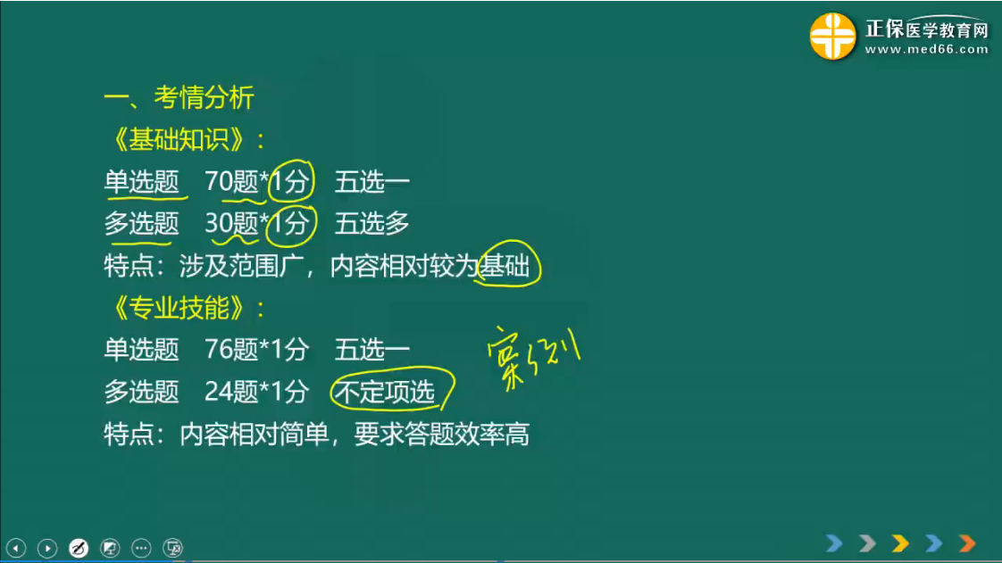 《專業(yè)技能》考試的特點(diǎn)為內(nèi)容相對簡單,要求答題效率高。該科目試題往往會(huì)更結(jié)合實(shí)踐、案例的方式進(jìn)行考核,一個(gè)接一個(gè)案例的考核大家,案例通常會(huì)表達(dá)某個(gè)個(gè)體或群體的健康狀況、行為習(xí)慣、生理生化指標(biāo)然后請考生回答1到5個(gè)小題。這種題型要求考生不僅要夯實(shí)基礎(chǔ),還要仔細(xì)的閱讀案例,剖析案例中說出現(xiàn)的個(gè)體或群體具備哪些特點(diǎn)以及在案例中它與我們所學(xué)過的哪些知識相銜接,綜上通過本科目考生需要具備更詳細(xì)的分析能力同時(shí)要做到觸類旁通和舉一反三。雖然《專業(yè)技能》考試對考生提出了相對更高的要求,但是歷年來考生的通過率也很高,只要考生能夠夯實(shí)基礎(chǔ)同時(shí)在考前復(fù)習(xí)中提高答題策略和技巧,那么通過考試不成問題!