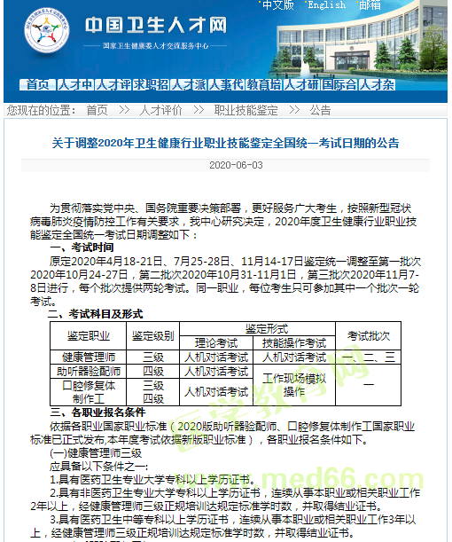 為貫徹落實黨中央、國務(wù)院重要決策部署,更好服務(wù)廣大考生,按照新型冠狀病毒肺炎疫情防控工作有關(guān)要求,我中心研究決定,2020年度衛(wèi)生健康行業(yè)職業(yè)技能鑒定全國統(tǒng)一考試日期調(diào)整如下: