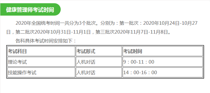 目前,2020年健康管理師考試時(shí)間已確定,2020年考試日期調(diào)整在10月、11月舉行,原定2020年4月18-21日、7月25-28日、11月14-17日鑒定統(tǒng)一調(diào)整至第一批次2020年10月24-27日,第二批次2020年10月31-11月1日,第三批次2020年11月7-8日進(jìn)行,每個(gè)批次提供兩輪考試。