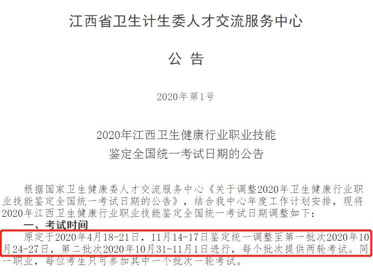 根據(jù)國家衛(wèi)生健康委人才交流服務(wù)中心《關(guān)于調(diào)整2020年衛(wèi)生健康行業(yè)職業(yè)技能鑒定全國統(tǒng)一考試日期的公告》,結(jié)合我中心年度工作計劃安排,現(xiàn)將2020年江西衛(wèi)生健康行業(yè)職業(yè)技能鑒定全國統(tǒng)一考試日期調(diào)整如下: