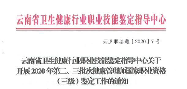 云南省衛(wèi)生使康行職業(yè)能定指導中心關于開展2020年第二、三次健康管理師國家職業(yè)資格(三級)鑒定工作的通知