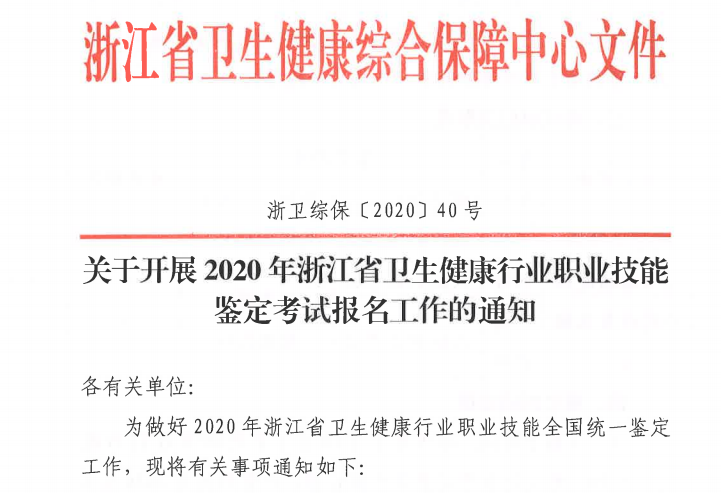 日前,浙江省衛(wèi)生計(jì)生人才網(wǎng)發(fā)布關(guān)于開展2020年浙江省衛(wèi)生健康行業(yè)職業(yè)技能鑒定考試報(bào)名工作的通知(浙衛(wèi)綜保〔2020〕40號(hào)),具體內(nèi)容如下: