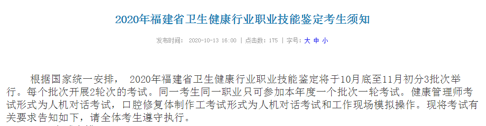 根據(jù)國家統(tǒng)一安排, 2020年福建省衛(wèi)生健康行業(yè)職業(yè)技能鑒定將于10月底至11月初分3批次舉行。每個(gè)批次開展2輪次的考試。同一考生同一職業(yè)只可參加本年度一個(gè)批次一輪考試。健康管理師考試形式為人機(jī)對(duì)話考試,口腔修復(fù)體制作工考試形式為人機(jī)對(duì)話考試和工作現(xiàn)場模擬操作?,F(xiàn)將考試有關(guān)要求告知如下,請(qǐng)全體考生遵守執(zhí)行。