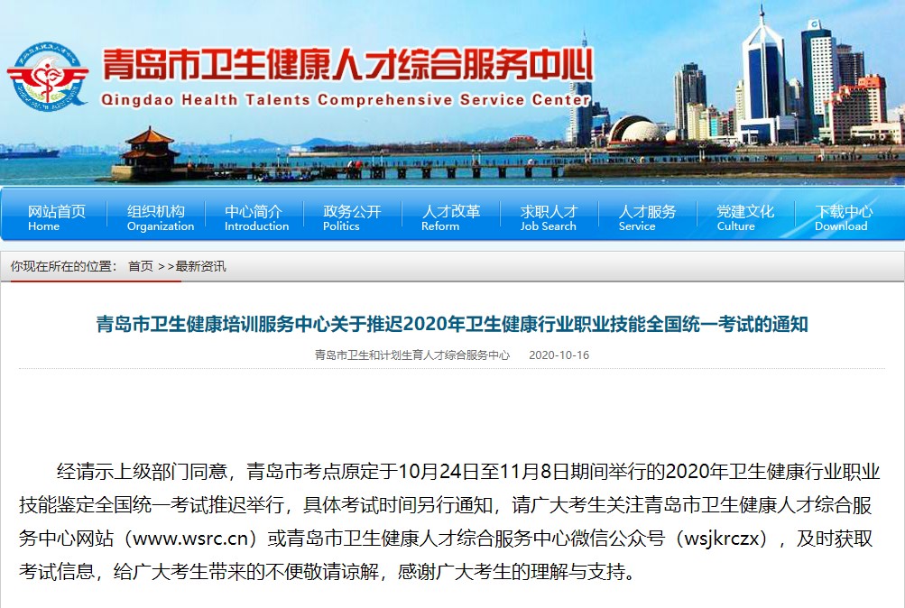 青島市衛(wèi)生健康培訓(xùn)服務(wù)中心關(guān)于推遲2020年衛(wèi)生健康行業(yè)職業(yè)技能全國統(tǒng)一考試的通知