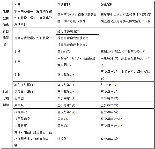常規(guī)管理:血糖水平比較平穩(wěn);無并發(fā)癥或并發(fā)癥穩(wěn)定的患者;不愿參加強化管理的患者。