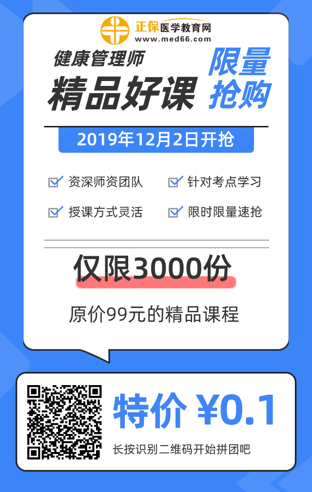 為了回饋廣大學(xué)員的報(bào)考熱情,醫(yī)學(xué)教育網(wǎng)專業(yè)師資團(tuán)隊(duì)傾情打造價(jià)值99元的2020健康管理師精品好課,3人拼團(tuán)即享0.1元驚喜價(jià),限量3000份,先到先得呦~