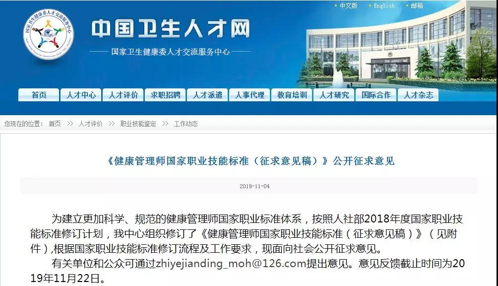 2019年11月4日,衛(wèi)健委發(fā)布了《健康管理師國家職業(yè)技能標準(征求意見稿)》,目前尚未出定稿。