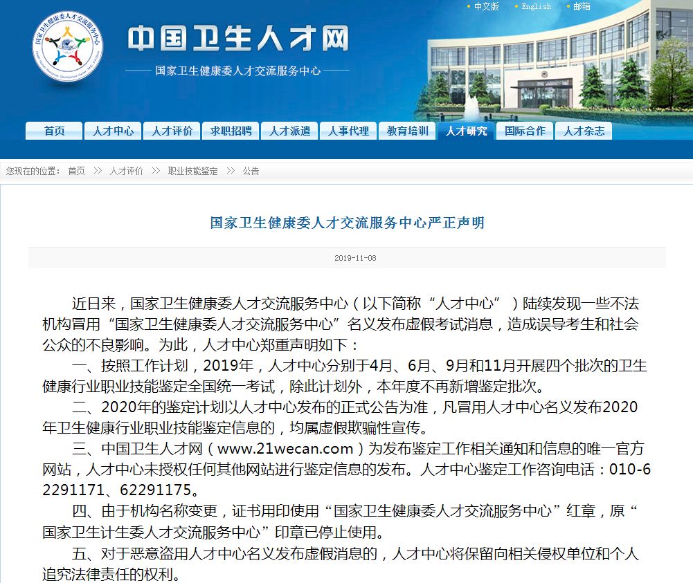 針對現(xiàn)在滿天飛的各種謠言,2019年11月8日,中國衛(wèi)生人才網(wǎng)專門發(fā)布了《國家衛(wèi)生健康委人才交流服務中心嚴正聲明》,強調健康管理師2020年相關鑒定計劃以中國衛(wèi)生人才網(wǎng)發(fā)布正式公告的為準,其他冒用人才中心名義發(fā)布的信息均屬虛假欺騙性宣傳。大家一定要擦亮眼睛,不輕信,不傳謠!