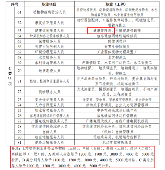 根據(jù)寧夏人力資源和社會保障廳官網(wǎng)發(fā)布的《寧夏回族自治區(qū)職業(yè)技能提升行動實施方案(2019-2021)》,職業(yè)技能提升行動培訓(xùn)補(bǔ)貼標(biāo)準(zhǔn)表中標(biāo)明健康管理師屬于C類,而且作為高級證書,可領(lǐng)3000元!