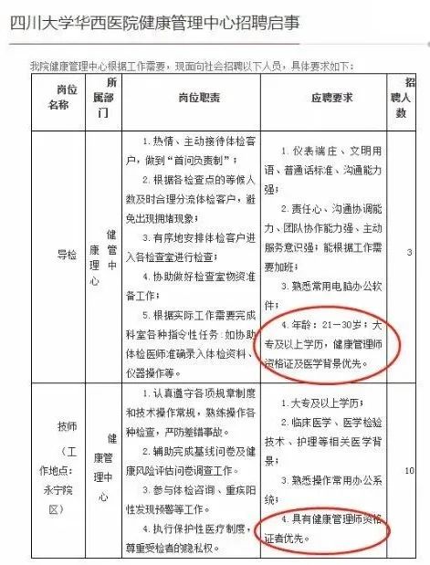 四川大學(xué)華西醫(yī)院設(shè)置健康管理中心并開始招聘健康管理人才,擁有健康管理師資格證書的應(yīng)聘者優(yōu)先考慮。