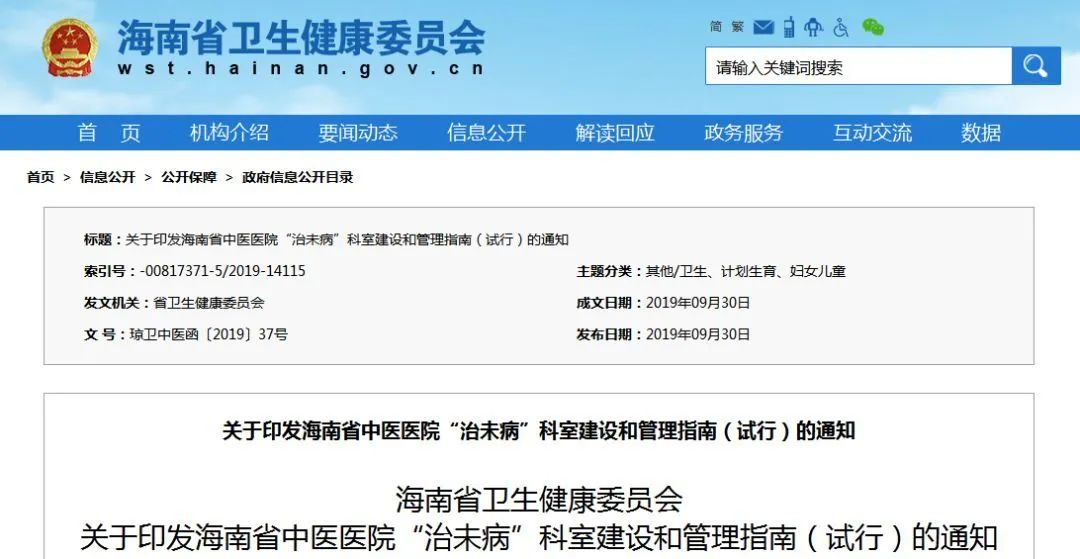 2019年9月30日,海南衛(wèi)健委發(fā)布《關(guān)于印發(fā)海南省中醫(yī)醫(yī)院“治未病”科室建設(shè)和管理指南(試行)的通知》(以下簡稱《通知》)。