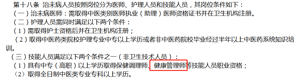 1)具有中專(高職)以上學(xué)歷取得保健調(diào)理師、健康管理師等技能人員職業(yè)資格;