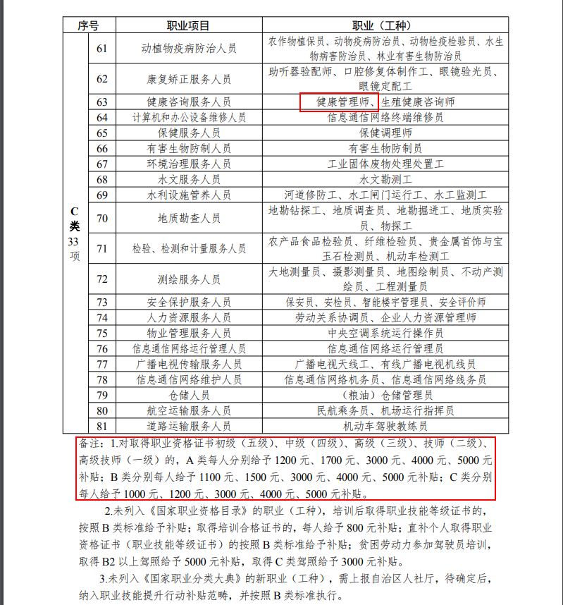 根據(jù)寧夏人力資源和社會(huì)保障廳官網(wǎng)發(fā)布的《寧夏回族自治區(qū)職業(yè)技能提升行動(dòng)實(shí)施方案(2019-2021)》,職業(yè)技能提升行動(dòng)培訓(xùn)補(bǔ)貼標(biāo)準(zhǔn)表中標(biāo)明健康管理師屬于C類(lèi),而且作為高級(jí)證書(shū),可領(lǐng)3000元!