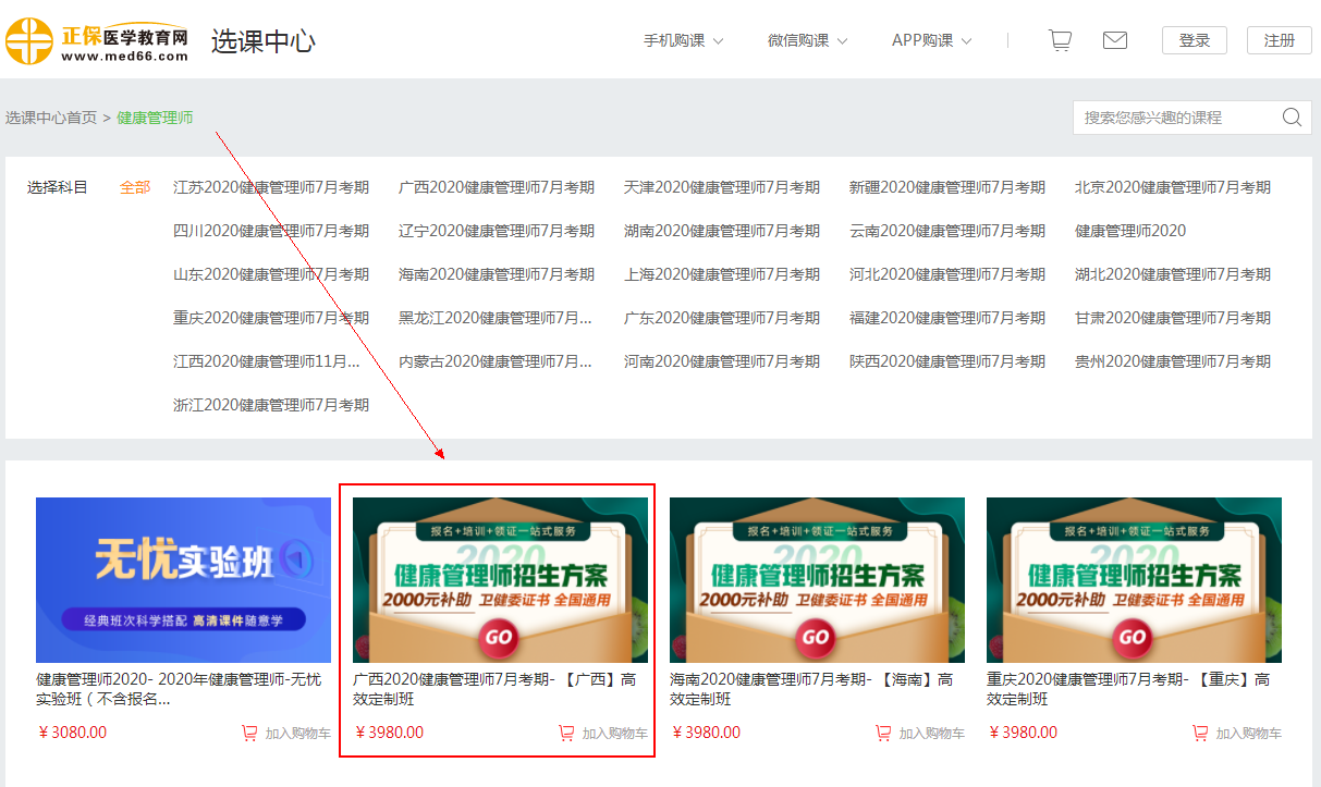 2、選擇你想報(bào)的課程(以下以廣西為例),加入購(gòu)物車;