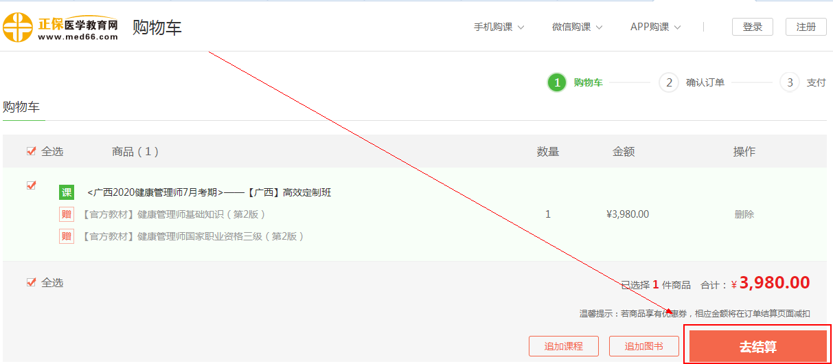 3、在購(gòu)物車確認(rèn)好課程之后點(diǎn)擊“去結(jié)算”,支付完成之后就能看課啦~