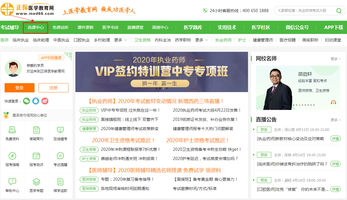 第一步,在醫(yī)學(xué)教育網(wǎng)首頁點擊“選課中心”;