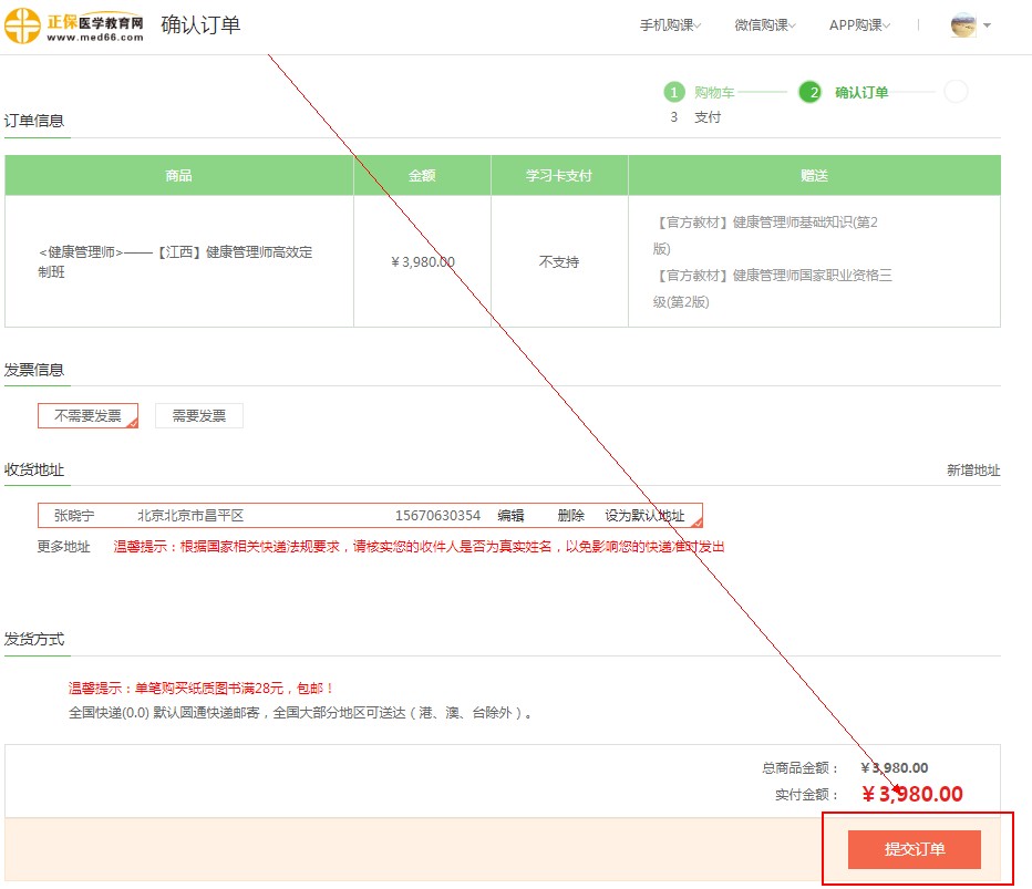 第三步:在訂單頁(yè)確認(rèn)無(wú)誤后,點(diǎn)擊“提交訂單”;