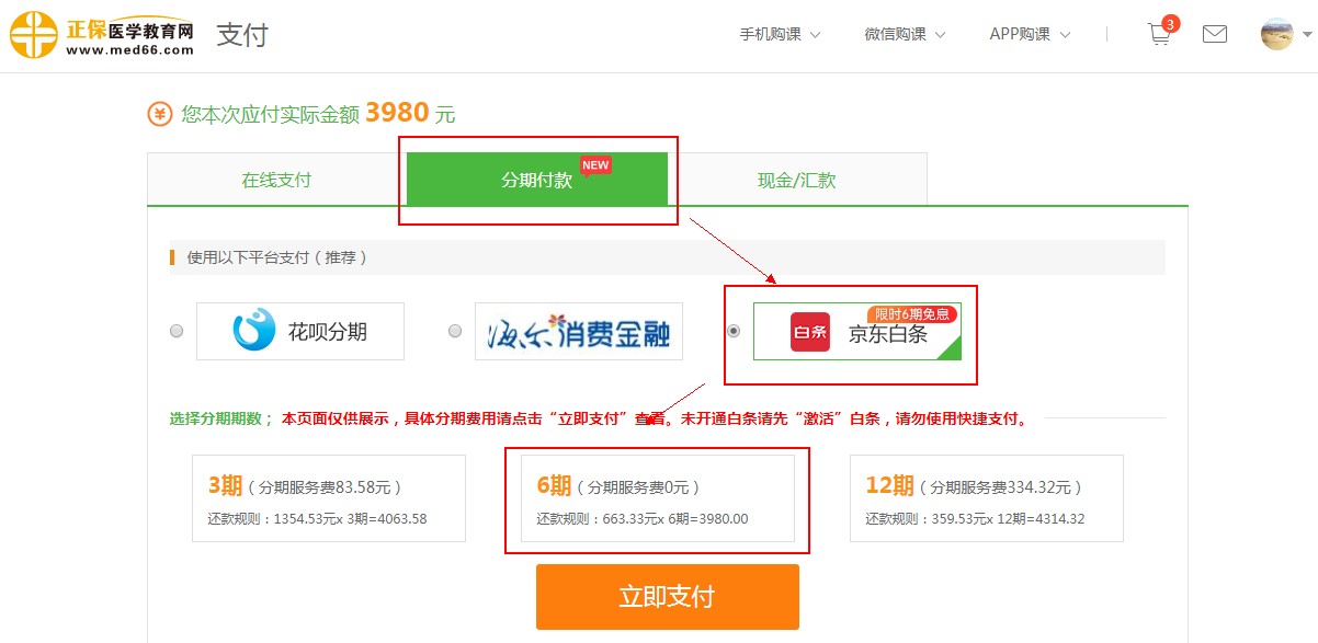 第三步:在支付頁面,選擇分期付款-京東白條進(jìn)行支付,分期期數(shù)一定要選擇6期哦!