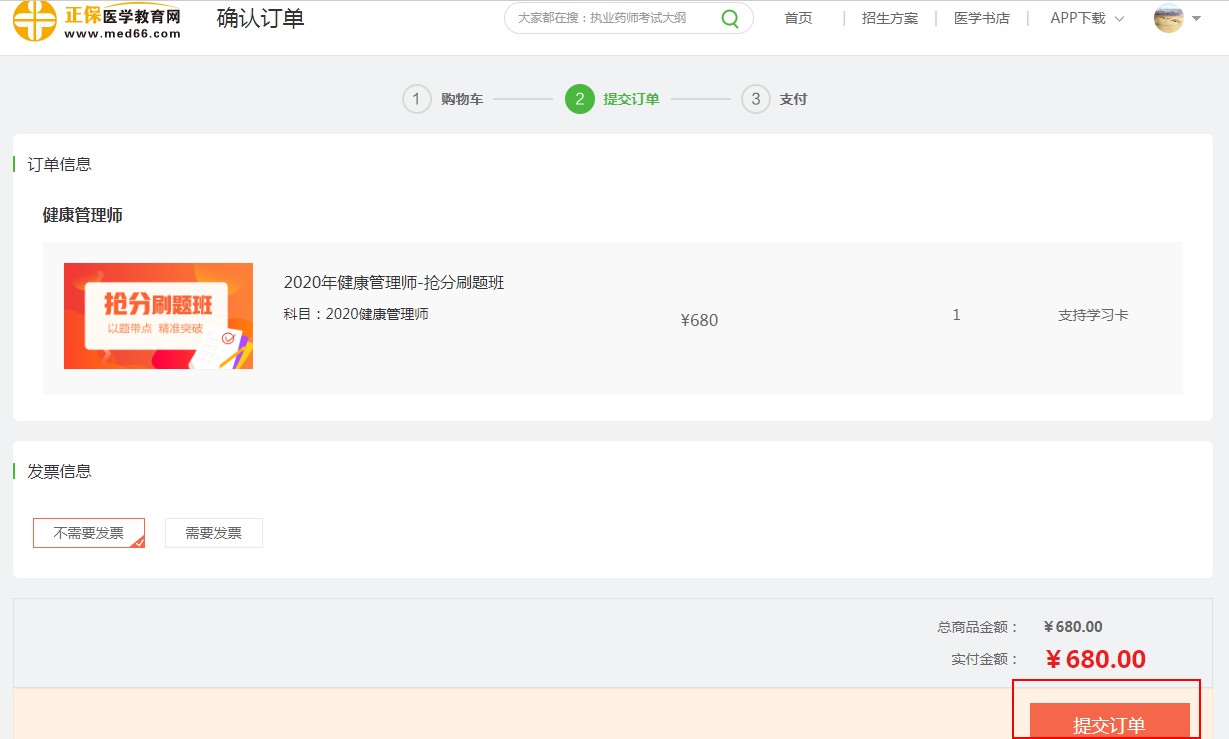第二步:在訂單頁確認(rèn)無誤后,點擊“提交訂單”;