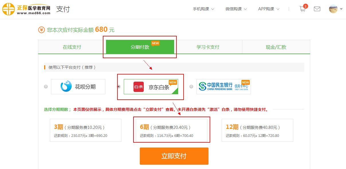 第三步:在支付頁面,選擇分期付款-京東白條進行支付即可(一定要選分6期哦)!
