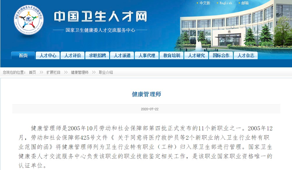 健康管理師是2005年10月勞動(dòng)和社會(huì)保障部第四批正式發(fā)布的11個(gè)新職業(yè)之一。 2005年12月,勞動(dòng)和社會(huì)保障部425號(hào)文件《關(guān)于同意將醫(yī)療救護(hù)員等2個(gè)新職業(yè)納入衛(wèi)生行業(yè)特有職業(yè)范圍的函》將健康管理師列為衛(wèi)生行業(yè)特有職業(yè)(工種)歸入原衛(wèi)生部進(jìn)行管理。國(guó)家衛(wèi)生健康委人才交流服務(wù)中心負(fù)責(zé)該職業(yè)的職業(yè)技能鑒定相關(guān)工作,是該職業(yè)國(guó)家職業(yè)資格唯一的認(rèn)證單位。